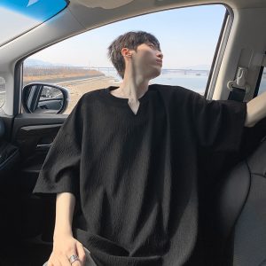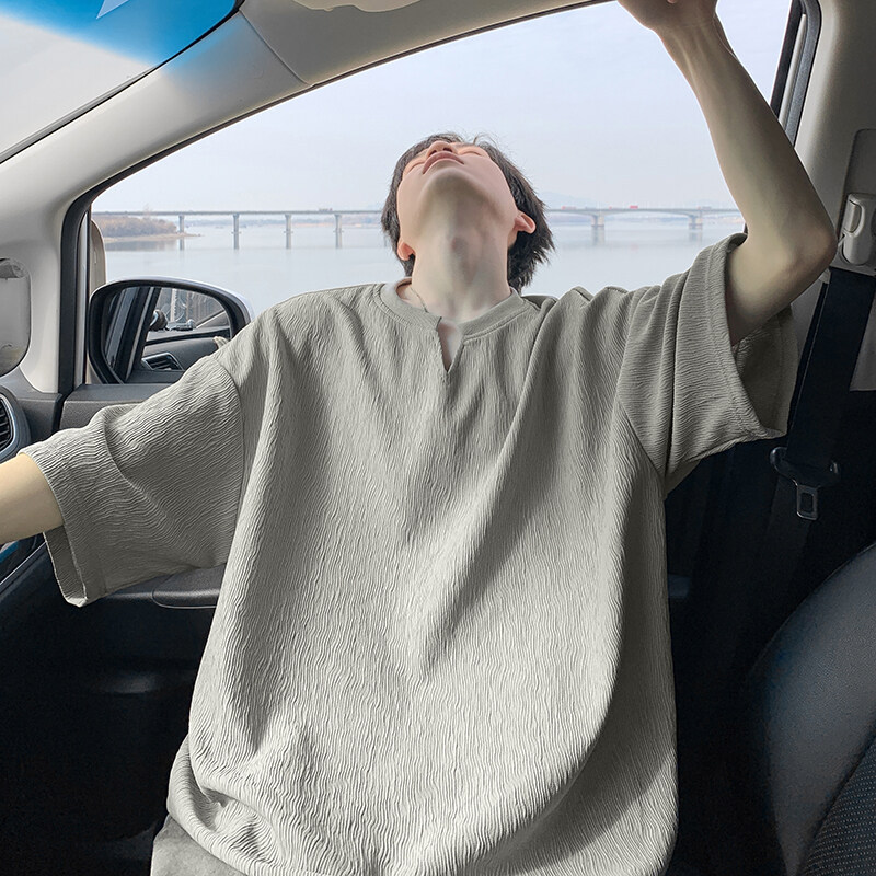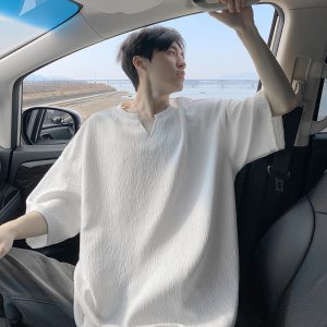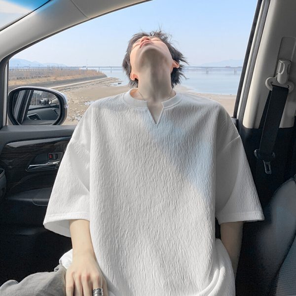 Textured V-Neck Short Sleeve T-Shirt for Men – Casual Loose Fit Summer Top